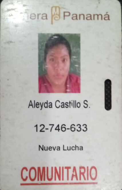 El carnet de Aleyda Castillo, la esposa fallecida de Milcíades Abrego Santos; emitido por Minera Panamá, para que los residentes de las comunidades confinadas puedan salir de sus casas y regresar a las mismas, en los días y dentro del horario establecido arbitrariamente por la empresa Minera Panamá S.A. cuya presencia y control en territorio nacional no tiene ningún sustento legal, según fallo de la Corte Suprema de Justicia que la empresa desacata bajo el silencio cómplice del gobierno nacional.