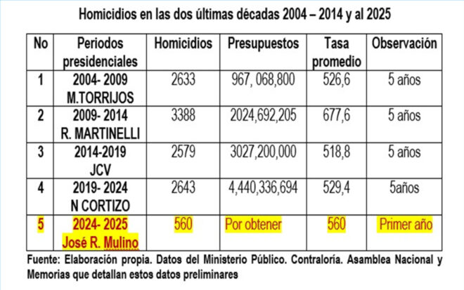 De acuerdo con los datos obtenidos por el Observatorio Criminológico Académico y Social, (OCAS), desde el año 2004 hasta 2025, se han implementado por parte de los gobiernos diferentes estrategias para combatir el problema de la criminalidad durante sus períodos de mandato hasta junio de 2025. No obstante, el propósito de esta investigación no consiste en cuestionar la eficacia del gobierno, sino en identificar las principales prioridades de nuestra nación y las acciones necesarias que debemos realizar para contrarrestar y neutralizar el problema mediante el enfoque de este análisis.OCAS, señala que recoger esta información es difícil porque hay pocas páginas web que ofrezcan estos datos, que deberían ser accesibles al público, lo que es necesario para crear un producto transparente sobre la información recopilada. Esto nos permite mostrar, según la tabla elaborada desde 2004 hasta ahora, un promedio de 500 asesinatos cada año en los distintos periodos presidenciales. También se puede ver que ha aumentado el presupuesto, pero los resultados delictivos no reflejan si la inversión en seguridad ha contribuido a la tranquilidad de la ciudadanía.
